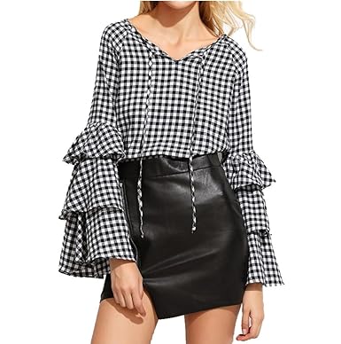 Chemise A Carreaux Femme Noire Mode Haut Manche Evasee Trompette