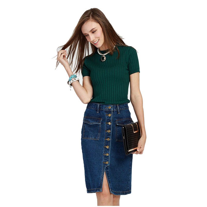 Acheter 2018 Ete Mode Femmes Denim Bouton Poche Decor Jupe Dames