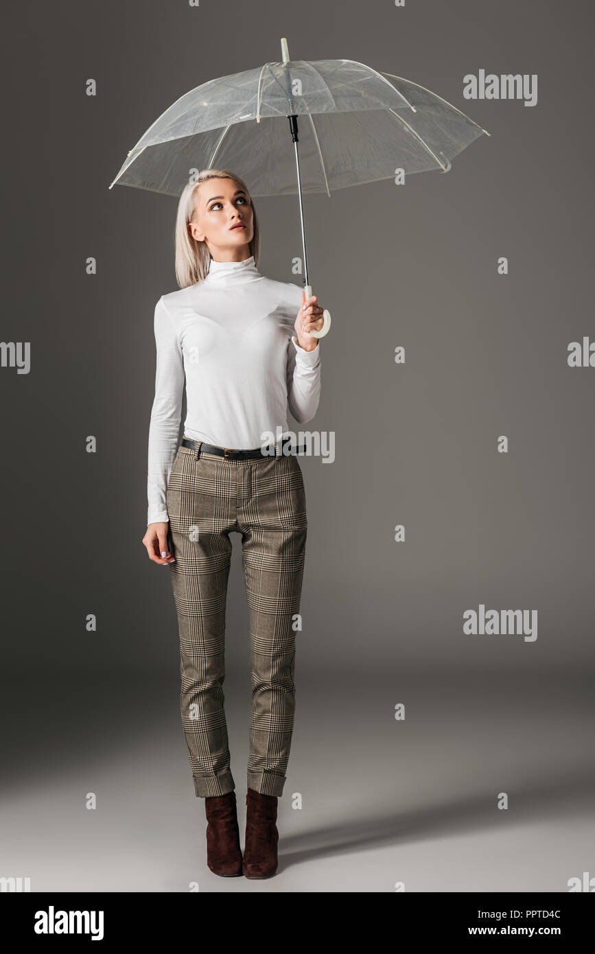 Mode Femme Elegante En Col Roule Blanc Et Un Pantalon Gris Posant