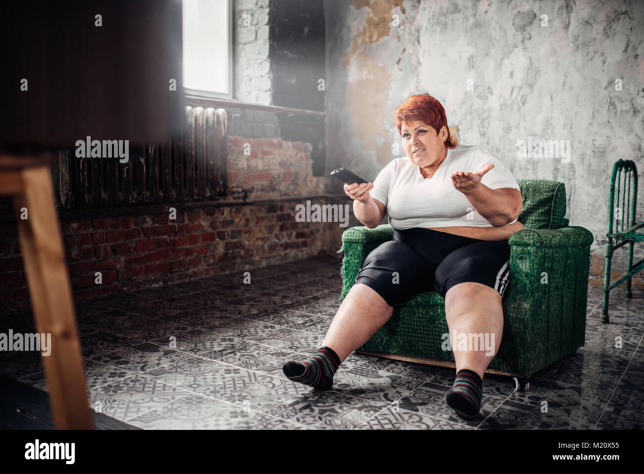 Grosse Femme Est Assise Dans Un Fauteuil Et Regarde La Television