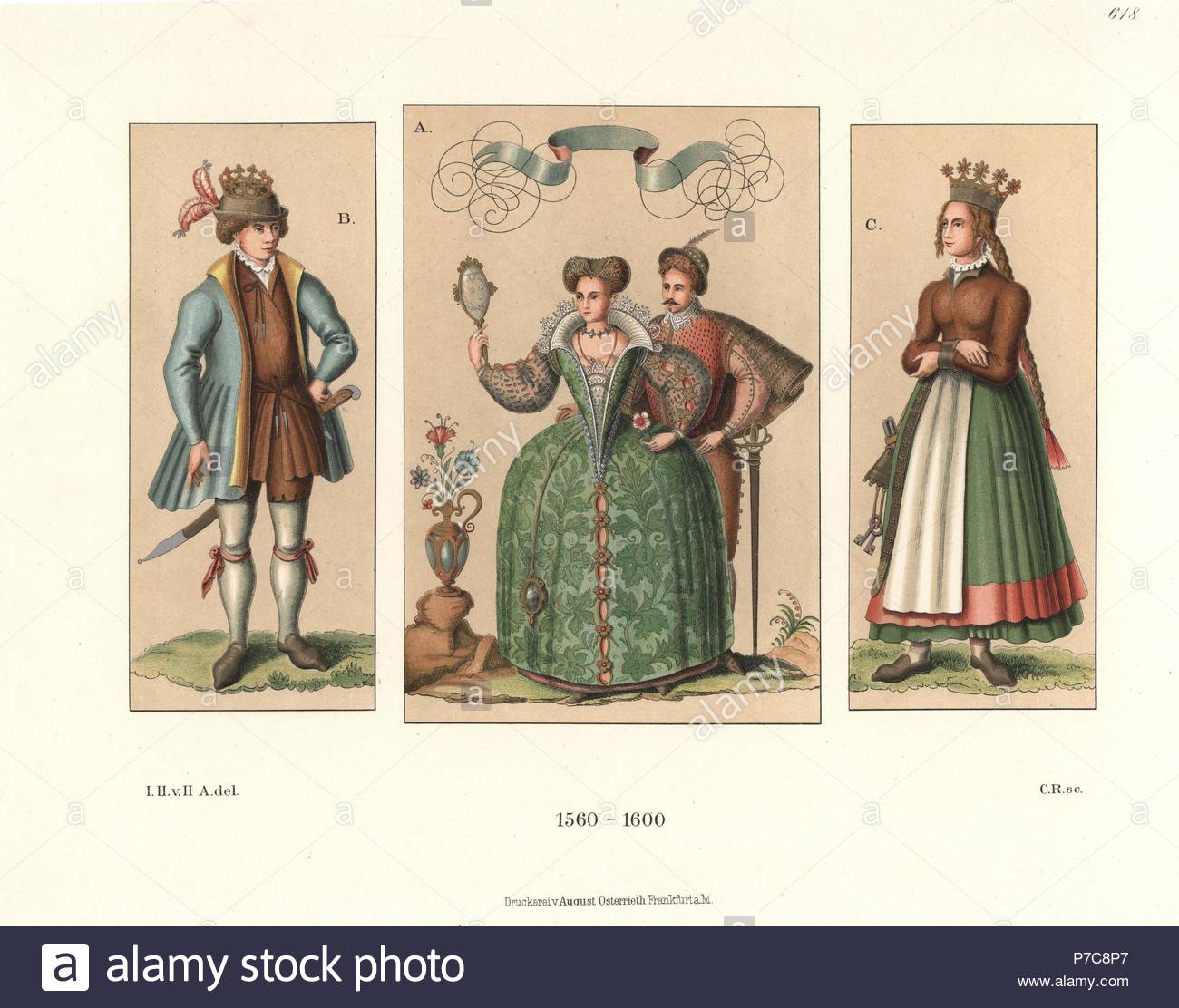Litho Portrait Couleur Costume Femme Mode Robe Cour Charles V Moyen